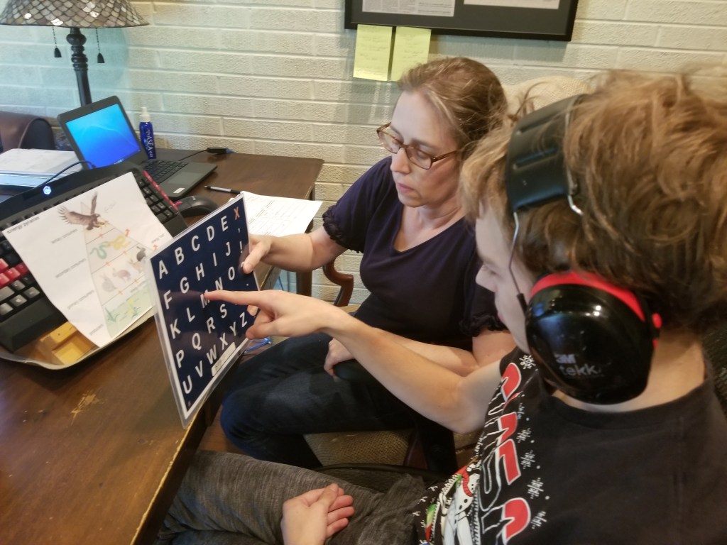 School this year for me is different. I am now taking two virtual classes concurrently with other students plus three at my own pace like I have done before. All my classes have someone at my side to hold the letterboard. My classes give me new content to learn and that is good. At this point, Biology is my favorite but it is also the hardest. I spend a long time on Biology homework and since my mom is my communication partner for that subject, our communication on letterboard has gotten much better, which is good.